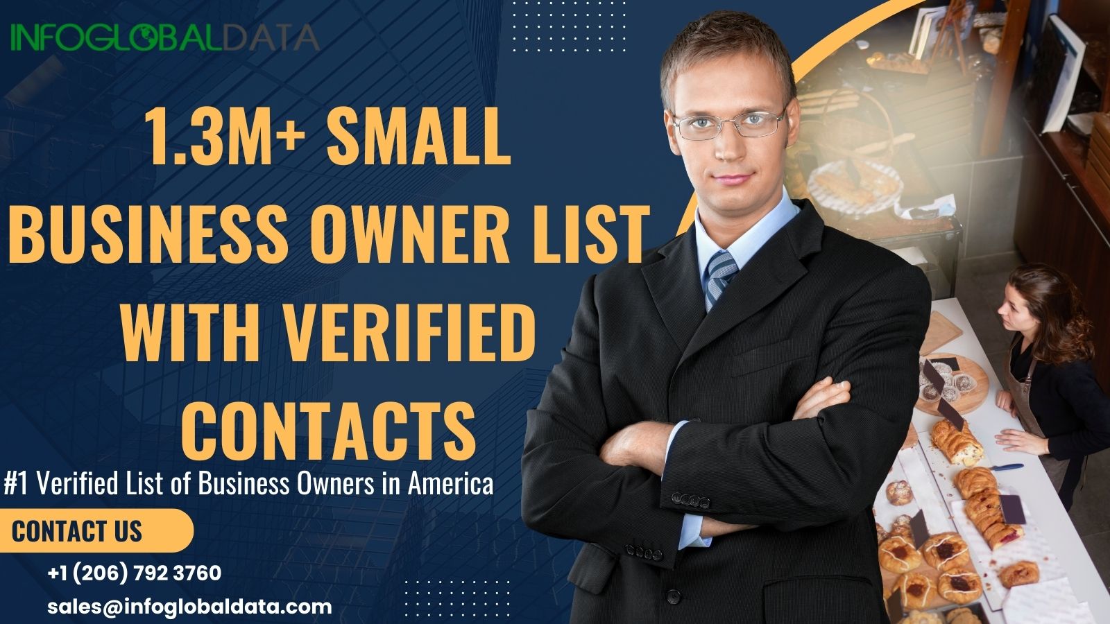 InfoGlobalData’s small business owners email list includes business names, owner/CEO names, email addresses, phone numbers, SIC/NAICS codes, industry type, revenue, and location.